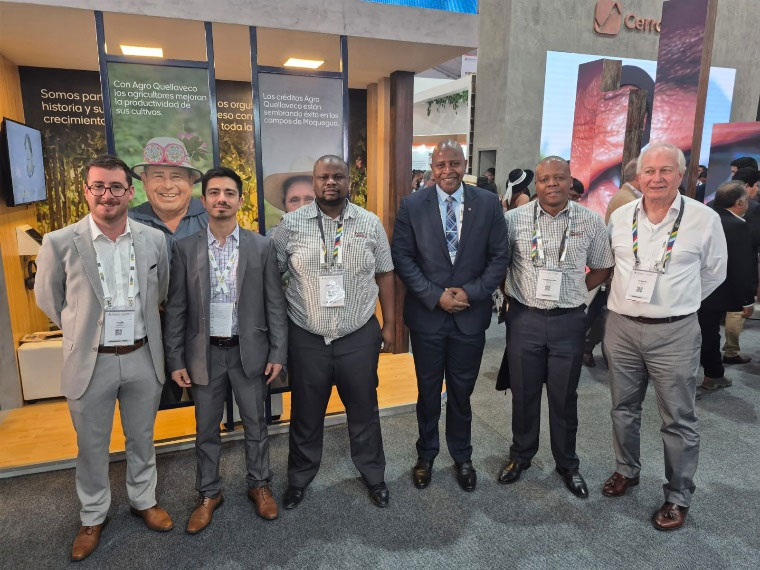 Módulo sudafricano en la Convención Minera PERUMIN 37. En la foto, de izquierda a derecha: Alwyn Van Biljon (Bird Machines (Pty) Ltd), Kerosha Ramjettan (Primera Secretaria de la Embajada de Sudáfrica en Chile), George Monyemangene (Embajador de Sudáfrica en Chile), Justin Macnab (Cónsul) y Juan José Quiroga Coronel (Capítulo de Ingeniería Minera de la Asociación de Ingenieros Profesionales del Perú y miembro de la Junta Directiva de SAPCHAM).