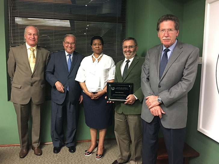 Entrega de Placa al Sr. Eduardo Rubio Roach en reconocimiento a su valiosa contribución como Fundador y Miembro del Consejo Directivo de SAPCHAM (de izquierda a derecha) Charles Dawson, BLEXIM S.A.C. y Director SAPCHAM; Guillermo van Oordt, Cónsul Honorario de Sudáfrica y Presidente de SAPCHAM; Embajadora de Sudáfrica en el Perú, Rachel Nomonde Rasmeni; Eduardo Rubio, ANGLO AMERICAN PERU S.A.C. y Vicepresidente de SAPCHAM; Herman Jacobs, Encargado de Negocios de la Embajada de Sudáfrica en el Perú - Diciembre 18, 2018.